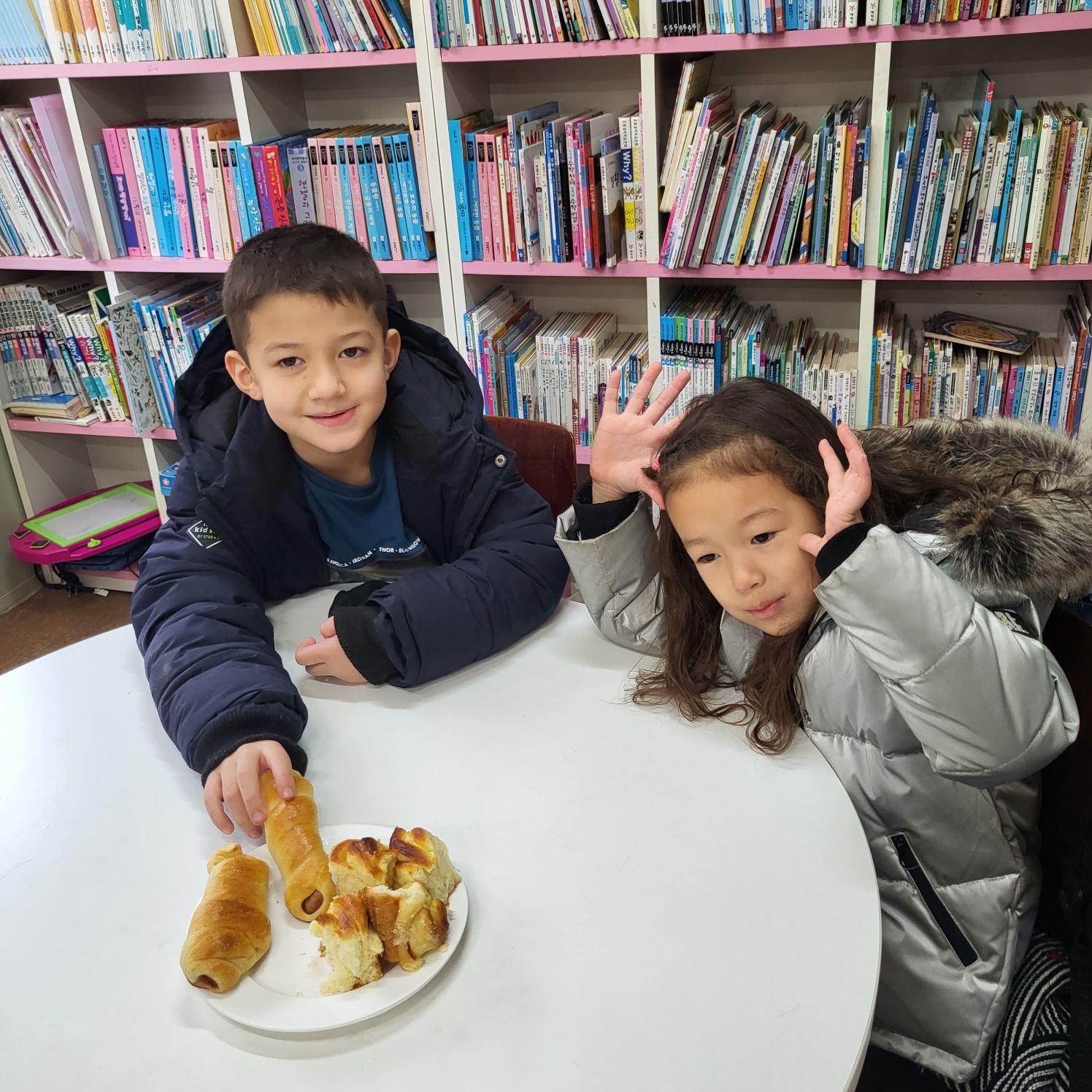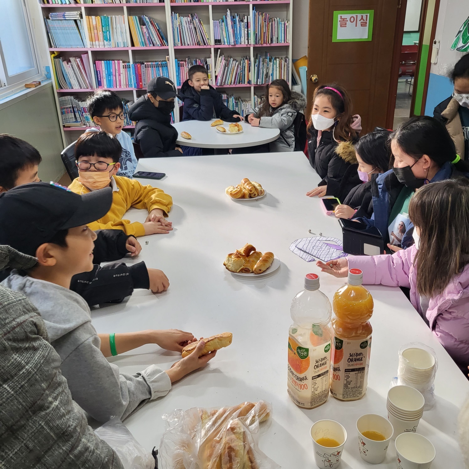수업이 끝나고 친구들과 다함께 모여 앉아서 맛있는 빵을 먹었어요